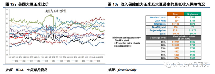 此前美国农业部子部门RMA已公布2023年的预期价格水平,美豆及美玉米分别为13.76美元/蒲及5.91美元/蒲,其中美豆的价格保障水平较去年下降57美分,玉米则小增1美分。尽管近期美豆11/美玉米12比价随美玉米大跌出现明显回升,导致按照即时价格测算的美豆种植收益超过玉米,但在需要理赔的年份,玉米相对偏高的赔偿价格及对应更高的最低收入保障对农户来说倒不失为一种确定性更强的安慰。