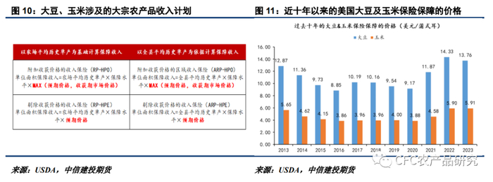 对于大豆、玉米来说,涉及的两个大宗农产品收入计划主要包括收入保险计划(RP)和区域收入风险保险(ARP)。收入保险主要承保被保险人因灾害而导致的产量下降(实际产量低于历史产量),或因市场价格波动(收获价格低于预期价格)导致的收入减少。而区域收入风险保险(ARP)则以区域平均单产为基础,通常以全县平均历史单产为依据计算保障收入,与投保农作物发生的实际损失无关。