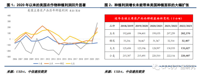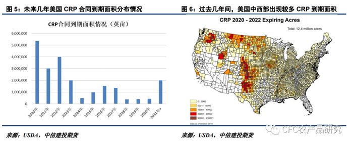 当前美国的CRP注册面积与玉米、大豆主要种植地区存在较多重叠,CRP注册面积的增减直接影响美玉米、大豆的种植面积。由于CRP合同一般为10-15年的长期合同,导致高种植利润未必能很快刺激种植面积增长,种植面积与种植利润之间存在一定时滞性,这显著体现于近几年超高的种植利润未能明显刺激美国种植面积的增长,CRP合同的到期时间在其中产生了重要影响。