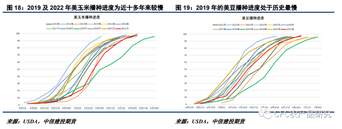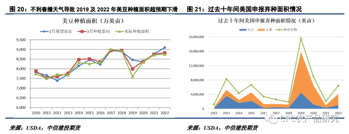 回溯过去的美国春播,因天气问题导致种植进度偏慢,最终出现较多弃种面积的,最近的2019年及2022年比较典型。在这两年里,播种期的过量降雨导致玉米及大豆种植窗口错失,最终使得种植面积未能实现种植意向的目标,出现偏高的弃种面积,也对相应年度的品种供需平衡表带来了较大影响。