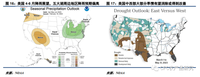 但美国总体旱情改善倾向明显,近来美国中西部地区降水良好有助于补充土壤墒情,截至2023年3月7日,美国国内出现旱情的区域占比54.87%,较去年11月85.28%有显著回落。CPC预测,今年春季美国中西部和五大湖地区的降水量将高于平均水平,这将缩小持续干旱的范围,后期中西部大部分地区的旱情有望获得相应改善或移除。考虑到目前美国中西部多数地区仍处于缺墒状态,高于正常水平的降雨将首先带来土壤湿度的改善,但预计将不足以出现过量降雨导致作物种植延迟甚至弃种的情况。