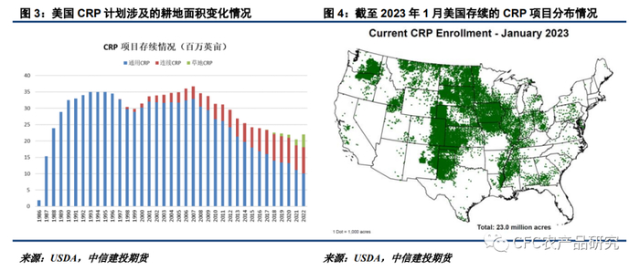 CRP休耕保护计划自1986年实施以来,其注册面积在经历了近十年的快速发展后,于2007年达到峰值后逐年下滑,近几年稳定至2300万英亩左右,受到注册面积上限的较大限制。2018年农业改善法案授权在2023年之前将注册上限从2400万英亩增加到2700万英亩,允许近几年CRP注册面积的扩张,但实际CRP注册面积却不增反降,因前期到期面积较多。FSA最新数据显示,截至2023年1月底,CRP土地注册面积总计为2304万英亩。其中,通用CRP注册面积为845.06万英亩,占比降至37%;连续CRP注册面积为822.81万英亩,占比维持36%;草地CRP注册面积为636.40万英亩,占比升至28%。