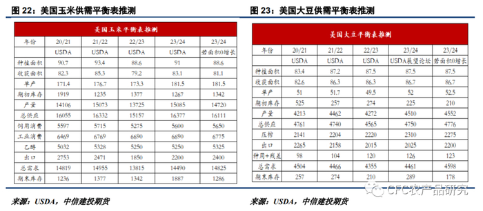USDA在2月份的年度展望论坛上预计,2023/24年度美豆播种面积为8750万英亩,与2022/23年度持平;美玉米播种面积为9100万英亩,同比增加240万英亩,较2022/23年度提高约3%。在当前美国中西部主产区仍有不同程度的旱情,在预期今年春播期的天气不会出现像2019年及2022年泛滥降雨的背景下,预计作物的实际种植面积与3月种植意向的偏差将有所缩小。