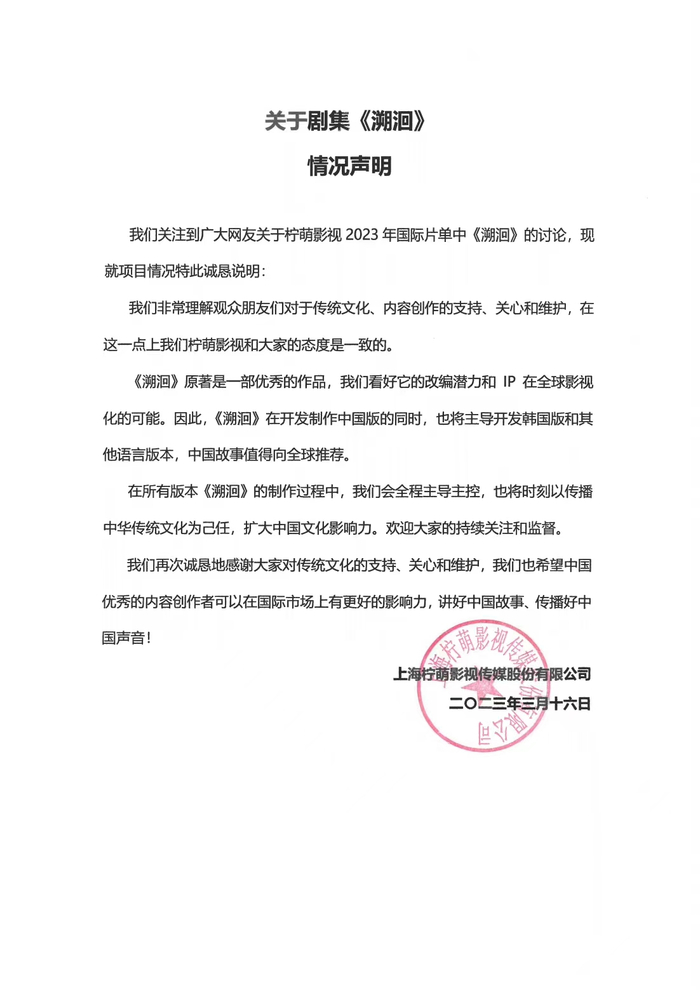 3月16日,@柠萌影视 就联合韩国制作团队开发古装剧《溯洄》一事发文回应称,《溯洄》原著是一部优秀的作品,公司看好它的改编潜力和IP在全球影视化的可能。因此,在开发制作中国版的同时,也将主导开发韩国版和其他语言版本。在所有版本《溯洄》的制作过程中,公司会全程主导主控,也将时刻以传播中华传统文化为己任,扩大中国文化影响力。