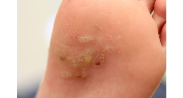 一开始有零散或成群的针尖大小水疱,内有清亮液体,可感觉到明显瘙痒或刺痛。等到水疱干燥吸收后会发生脱屑。这是典型的水疱型脚气。