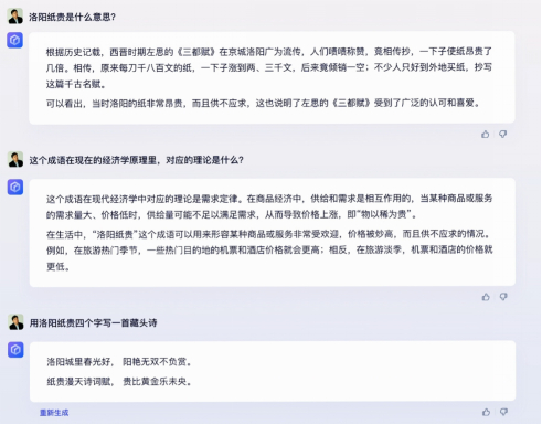 为展示文心一言的中文表达能力,李彦宏现场就“洛阳纸贵”的典故输入了以下问题:洛阳纸贵是什么意思?当时洛阳的纸到底有多贵?这个成语在现在的经济学原理里,对应的理论是什么?用洛阳纸贵四个字写一首藏头诗。