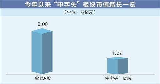 “中字头”板块涵盖我国基建、通信、军工、石油等核心领域的大型国企,在A股中属于“少而精”,以占比不到全部A股3%的上市公司数量,却拥有占A股整体16.43%的总市值。在本轮上涨行情中,“中字头”板块贡献巨大。年初以来,全部A股总市值增长合计5万亿元,其中“中字头”板块市值增长就达到1.87万亿元,占比超过增量的三分之一。