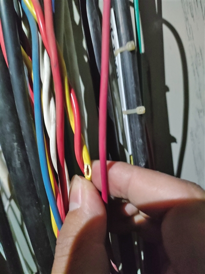 2022年12月底,记者在这名业内人士的陪同下来到这个小区,发现这个小区的管道内尚遗留一些这样的劣质消防电线,这些电线的胶皮用手很容易剥开,剥开后可以清楚看到里面的铜丝粗度明显不符合要求,据这位业内人士估计,这种电线的售价极低,可能只要六七十元每卷。