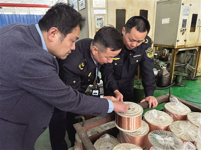 3月16日下午,宜兴市市场监督管理局执法人员对涉事企业工厂内摆放的电线进行检查。