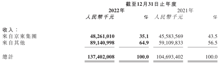 财报显示,2022年,京东物流外部客户收入为891亿元,同比增长50.8%,外部客户占比提升至64.9%;来自京东集团的销售收入为483亿元,同比增长41.7%。由于外部客户销售收入增速更高,京东物流来自京东集团的收入占比由43.5%降至35.1%。