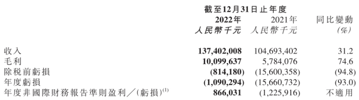 2022年全年,公司实现营业收入1374.02亿元,同比增长31.20%;实现净利润-10.90亿元,较上年同期(-156.61亿元)大幅减亏93%。经调整后的非国际财务报告准则盈利为8.7亿元,同比成功扭亏。