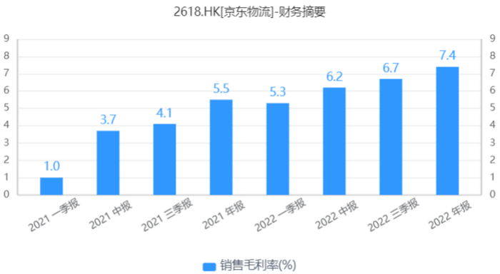 进入到2022年,京东物流毛利率水平有所提升。数据显示,2022年Q1-Q4,京东物流毛利率分别为5.3%、6.9%、7.4%和8.8%。2022年全年,京东物流毛利率为7.35%,同比上升1.8个百分点。
