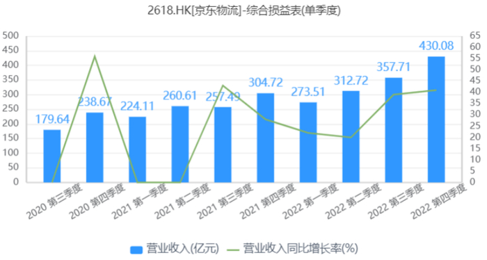 分季度来看,2022年Q1-Q4,京东物流营收增速分别为22%、20%、39%和41%,德邦物流的收购对京东物流营收端提振明显。