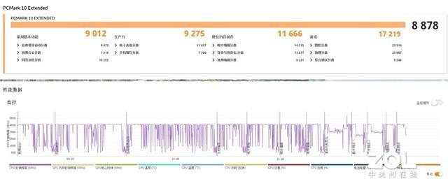 PCMark 10扩展模式测试中,其在常用基本功能,包含Web浏览、视频会议、应用程序启动等得分为9012分,说明其完成这些基础办公任务没有任何问题;而在生产力项目测试中得分为9275分,表明其拥有高效的电子表格、文档工作性能;数位内容创作方面,其评分高达11666分,说明其能够非常高效地完成图片、视频、图形渲染等工作;游戏性能方面的评分更是高达17219分,综合得分为8878分,是一款各方面实力都不错的全能产品。