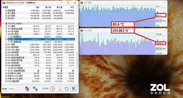 Furmark的GPU单烤机测试,1080P分辨率下,GPU功耗释放104.863W,也就是满功耗105W释放,同时可以看到,此时GPU温度控制在了80.6℃,GPU功耗与散热表现俱佳。
