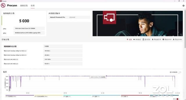 考虑到微星星影15的配置,在应用测试中我们主要参考了UL Procyon的视频编辑性能测试,它通过Adobe Premiere软件的真实操作,衡量电脑的实际应用性能。实测星影15评分达到了5030分,是效率相当不错的视频剪辑平台。