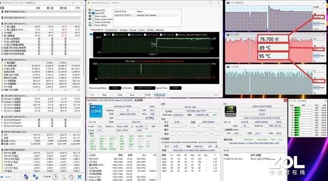 首先在AIDA 64 Stress FPU压力测试下,处理器核心温度被控制在89℃左右,不过封装温度达到95℃,功耗稳定在76.7W,单烤功耗释放和散热都不错。