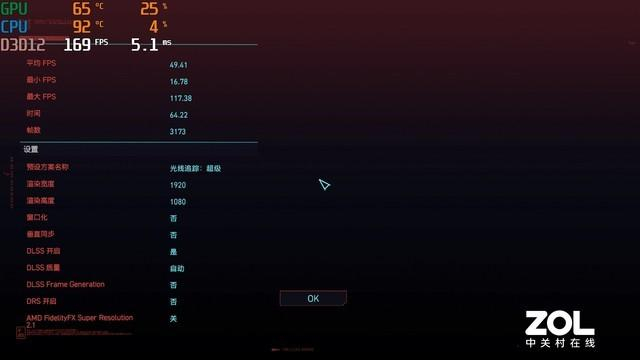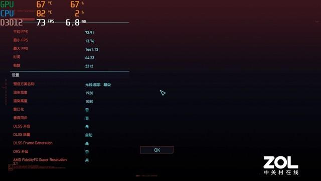 1080P分辨率+超级光追模式,DLSS自动的情况下,平均帧数可以达到49.41fps,与RTX 3060独显运行这款游戏的帧数差不多。但是别忘了,RTX 40系显卡可是支持DLSS3的,下面我们测试一下打开DLSS3之后的帧数表现。
