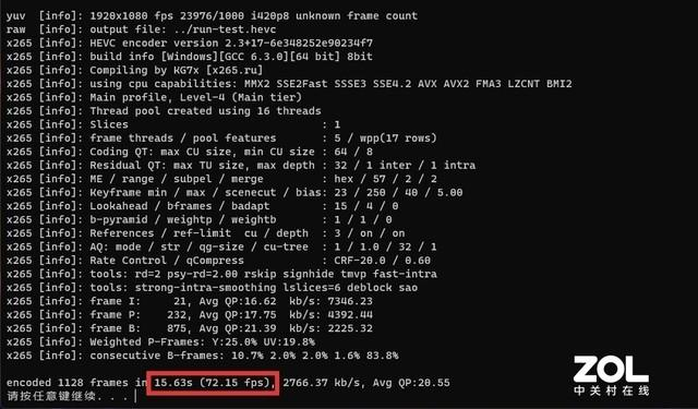 X265 Benchmark下,编码1128 frames 1080P视频耗时仅15.63秒,帧率达到72.15fps,H.265编码效率同样是大幅提升。
