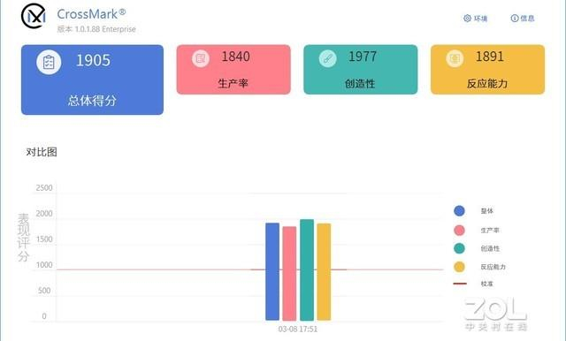 首先在CrossMark生产力性能测试中,其综合得分达到1905分,生产力单项得分1840分,创造力得分1977分,响应能力得分1891分,各项得分比较均衡,没有明显短板,在Office办公、图片处理等方面有着不错的效率。