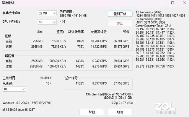 参考7-Zip基准测试,完成10轮压缩解压缩测试耗时为64.594秒,总体评分87.756GIPS,压缩速度达到75215KB/s,解压缩速度达到1007459KB/s。