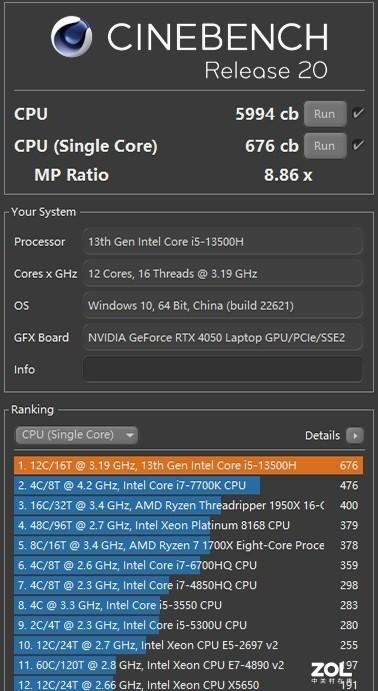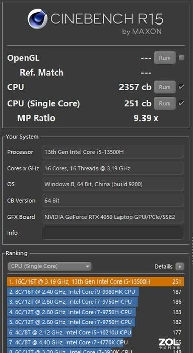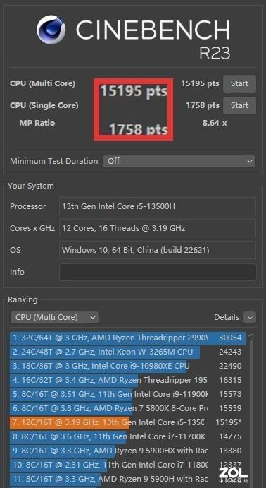 CINEBENCH测试标准下,CINEBENCH R15多核2357cb、单核251cb;CINEBENCH R20多核5994cb、单核676cb;CINEBENCH R23多核15195pts、单核1758pts。从CINEBENCH各项评分也可以看出,单核与上一代相比基本持平,多核性能有所提升。