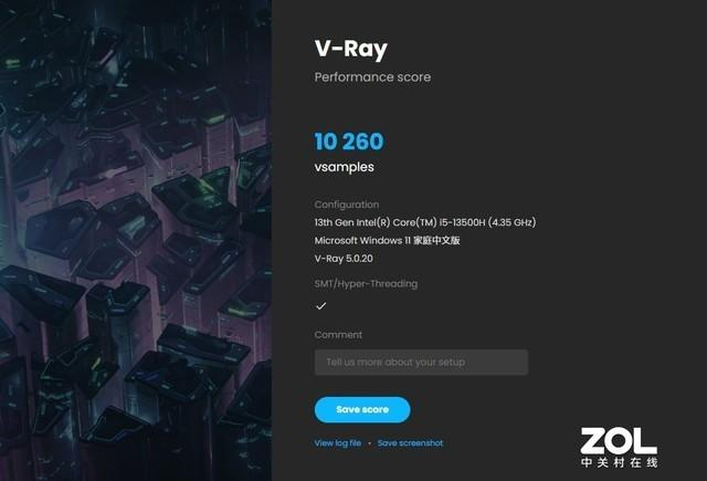 图像渲染能力方面,首先我们参考V-Ray Benchmark的测试。纯物理CPU渲染采样数量高达10260 vsamples。13代酷睿i5在V-Ray渲染上已经破万,比上一代要好不少了。