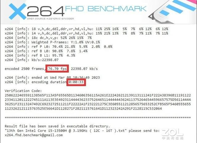 视频编码性能方面,我们使用X264 FHD Benchmark以及X265 FHD Benchmark进行了测试。X264 Benchmark下,编码2500 frames 1080P视频耗时仅33秒,帧率达到76.7fps。不得不说英特尔13代酷睿的H.264编码效率提升还是比较大的。