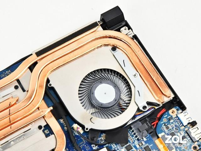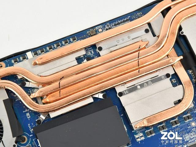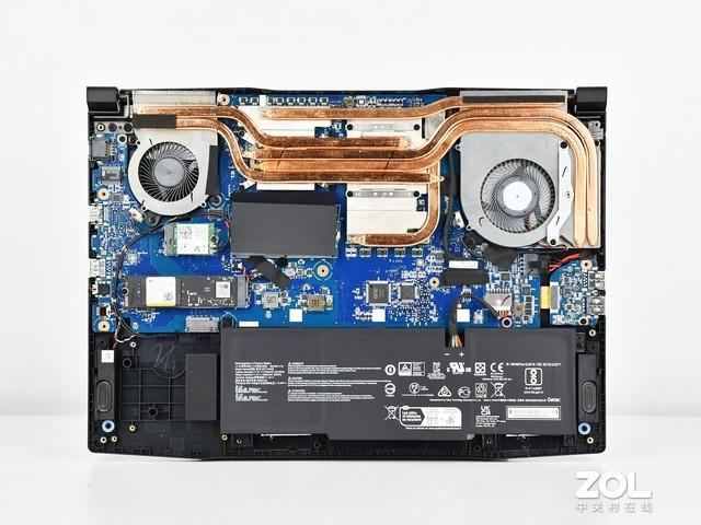拆开后盖可以看到星影15内部的微星酷寒散热系统全貌,它由六根热管+双风扇组成,中间的CPU与GPU共享四根热管,这样就使得两大核心硬件同时能够享受到双风扇导热,整体散热效率自然得到保障。