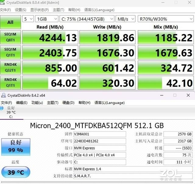 硬盘方面,这款产品搭载了一块美光512GB PCIe 4.0固态硬盘,实测其Q8T1顺序读取速度4244.13MB/s,写入速度1819.86MB/s,4K Q1T1随机读取速度为64.02MB/s,写入速度为320.3MB/s。