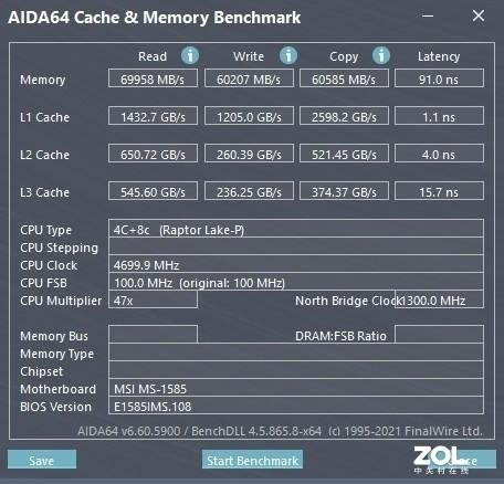 微星星影15的存储性能也是相当不错,这是其系统和游戏流畅运行的根基。星影15搭载了2×8GB DDR5内存,通过AIDA 64实测,其内存读取速度达到69958MB/s,写入速度60207MB/s,拷贝速度60585MB/s,延迟降低到了91ns,整体表现非常不错。