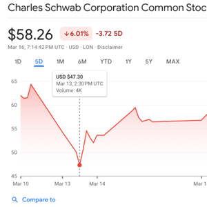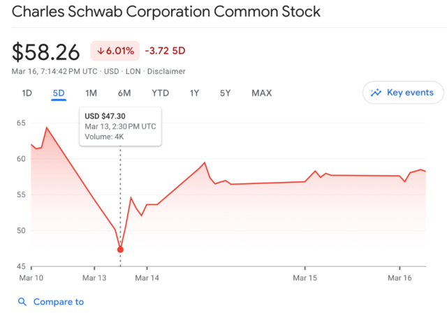在硅谷银行倒闭的波及下,嘉信理财一度三天暴跌超30%,股价在3月13日股价曾一度低至47美元,创两年来新低。