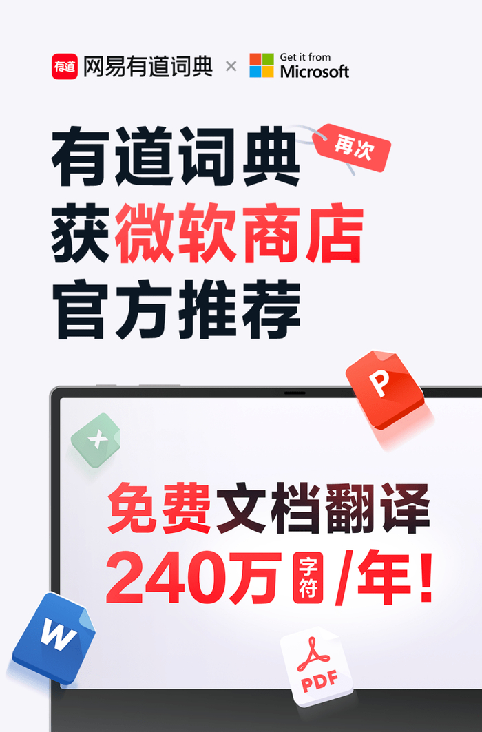 今天,网易有道词典又一次获得微软官方力荐,这表明微软对于有道词典近期释放重大升级的高度认可——网易有道词典的核心功能文档翻译功能向全体用户免费开放,并大幅扩充向用户免费开放的“文档翻译”权限,从每年10万字符/年增至每年240万字符的“狂飙”,可一键轻松搞定包括论文在内的各种文献翻译,足以翻译240篇论文、期刊,400本短篇小说,600篇专业文档,2400篇新闻外刊……轻松满足大多数职场、学术、学生等人群的办公、学术研究与学习需求。