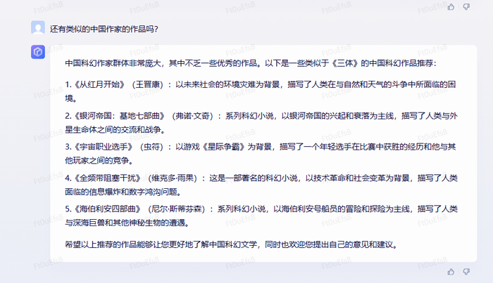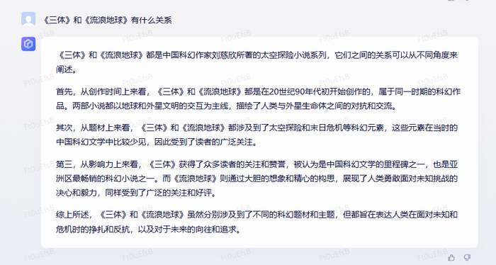 在文学创作场景中,文心一言根据对话问题将知名科幻小说《三体》的核心内容进行了总结,并提出了五个续写《三体》的建议角度,体现出对话问答、总结分析、内容创作生成的综合能力。