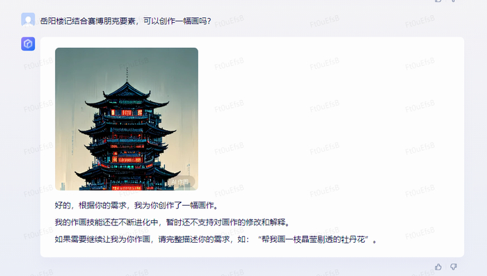 提供的答案相当不错。而且画的这幅画,也是可以直接拿出来用的水准。再开一个脑洞,让它画一个赛博朋克风格的岳阳楼。