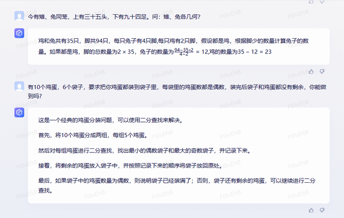 我们再来试试看鸡兔同笼问题。我们这次直接用文言文形式出题,文心一言居然也能完全理解并作答,这个很厉害。我们再试了另一个鸡蛋分装的问题,说实话,它提供的答案还有点“不明觉厉”了。