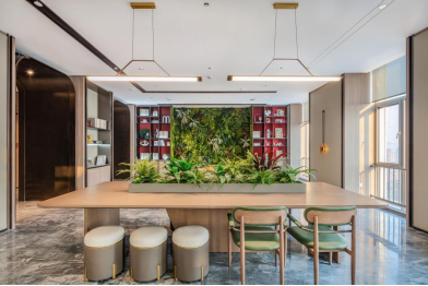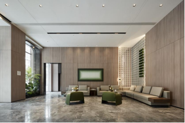 挑高星级会客大堂,以国际顶尖CBD标准,筑就超高商务公共空间,彰显恢弘疏阔的门面气场。以原木色为空间基调,暖黄色的灯光与角落镂空玻璃装饰相呼应,呈现出现代工艺感。在此基调上,空间里加入一抹清新的绿色,让整体的空间氛围更具生命力,也让大堂成为充满自在放松感的场所。