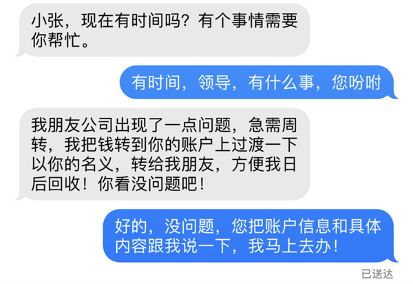 在iMessage信息诈骗中,首先,诈骗分子通过非法渠道获取受害人及其关系人的个人信息,使用iMessage发送信息,以“新换号码”为由,要求受害人添加其微信或继续通过iMessage聊天。第二步,骗子用关心下属工作的口吻,让受害人以为自己的工作得到领导的肯定,极大降低戒备之心。第三步,骗子会以“私事交给你办比较放心”等理由,拉近与收信人的关系,让收信人觉得“领导”或“熟人”把他当成“自己人”,从而进一步放松其警惕,最终实施诈骗。