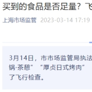 中国经济网北京3月17日讯 上海市市场监督管理局公众号“上海市场监管”于近日发布消息称,3月14日,上海市市场监管局执法总队会同市计测院,对位于打浦桥日月光的“湊湊火锅·茶憩”“厚贞日式烤肉”“盒马打浦桥日月光店”“来伊份日月光中心店”开展了飞行检查。