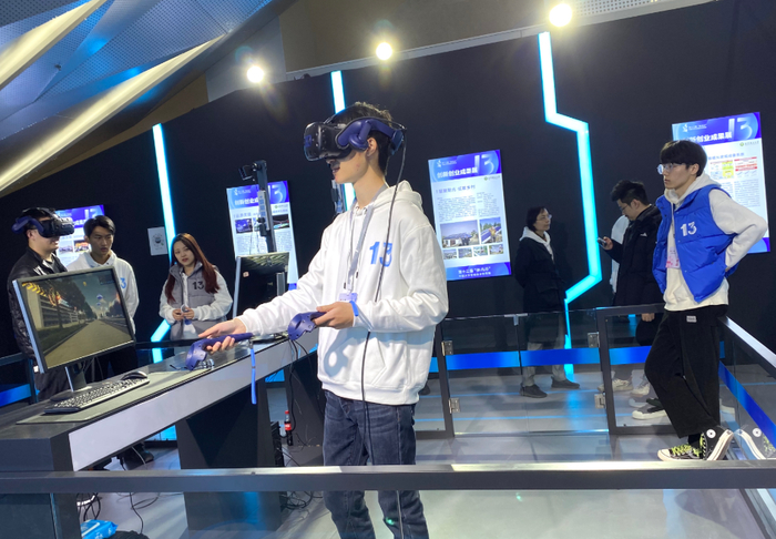 作为本届“挑战杯”竞赛的一大亮点,元宇宙大型沉浸式数字交互空间站也在展览中首次亮相。元宇宙空间站采用了大规模即时云渲染技术,在数字空间中构建北理工良乡校区数字校园、“挑战杯”创新创业成果虚拟展厅、“挑战杯”云舞台等场景。观众可以佩戴上虚拟现实眼镜,走进元宇宙世界,选择感兴趣的成果作品,沉浸式浏览、体验和互动。元宇宙创新创业成果虚拟展厅共展出参与“挑战杯”竞赛的5000余件创新创业作品。