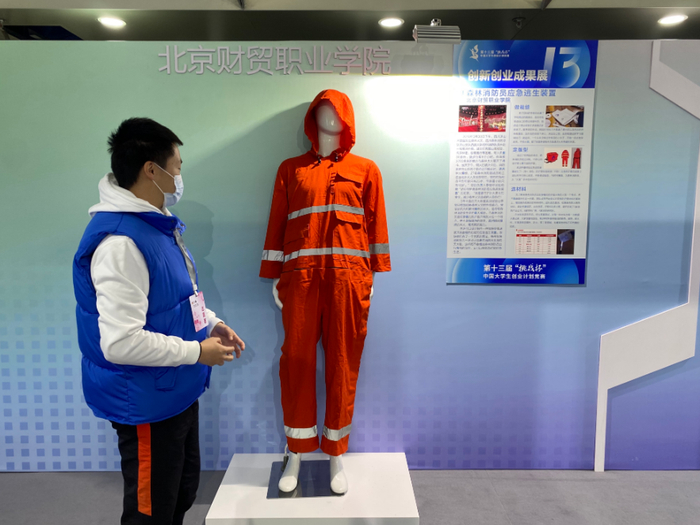 “这件衣服看着普通,实际上技术含量十足。”在一件橘红色消防服前,北理工材料学院学生志愿者廖伟懿向观众介绍,“在发生火灾的危急时刻,它可以在2秒内从一个巴掌大的小挎包转换成防护服,帮助消防员抵御超500摄氏度的火焰。”这件森林消防员应急逃生装置由北京财贸职业学院学生团队设计研发,团队在现有防护服材料的基础上,增加隔热效果好的特殊材料,通过反复测试,不断修改版型,最终研发出这件实用的消防服。观众们听着讲解,纷纷好奇地伸手上前抚摸。在他们身边,还有复合磁场驱动微机器人系统、深光增强现实投影台灯、肤质检测仪等多件大学生创新创业实物作品展出,吸引了不少观众驻足观看。