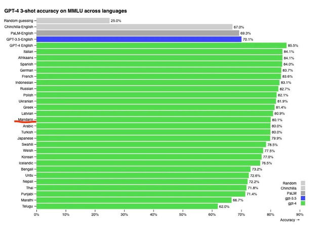 通过 Azure Translate 模组将 MMLU 测试转译成多种语言后,GPT-4 依然保持高水平发挥,中文准确率达到了 80%,甚至比GPT3.5的英语还要好。