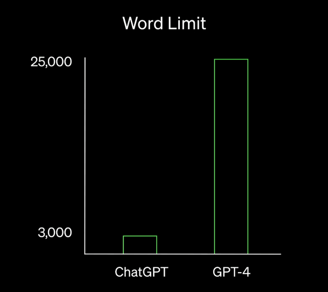 GPT-4可以处理超过25,000字的文本,这使得包括生成长内容、长对话以及文件搜索和分析在内的使用案例成为可能。