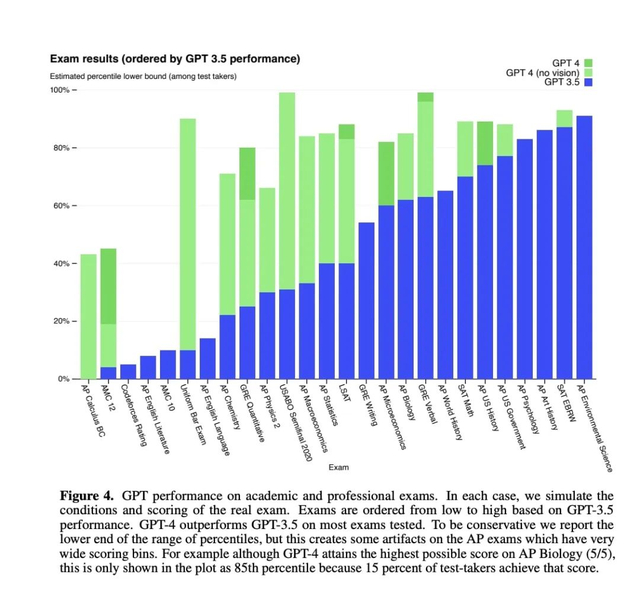 GRE语文测试中,GPT-4超过了99%的考生,GPT3.5只有63%;数学GPT-4考了163分(满分170),超过80%考生,GPT3.5只能超过25%。