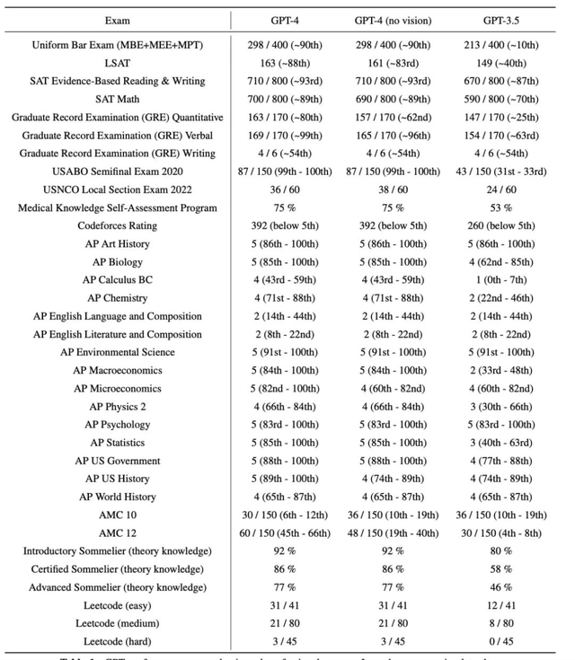 美国高考SAT,GPT-4考了1410分(阅读写作710分、数学700分,满分均为800),GPT3.5 的得分仅为1260 分。