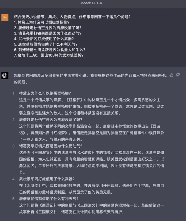 更好的推理能力,使GPT-4能够分析复杂的问题并提供更准确的解决方案。比如你问它“林黛玉为什么可以倒拔垂杨柳”,它终于不是一本正经地胡说八道了。