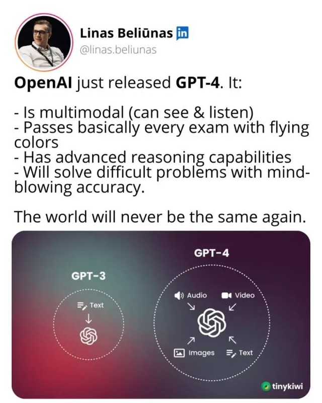 简而言之,就是GPT-4不仅能理解文本,还能理解和处理图像、视频、音频等。换句话说,GPT-4学会了一“心”多用,它可以用不同的方式处理一件以上的事情。