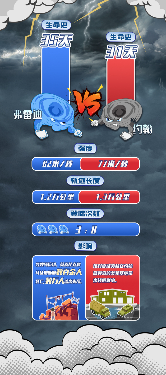 在影响方面,“约翰”远逊于“弗雷迪”。在长达一个月的生命史内,“约翰”没有登陆,仅对夏威夷群岛和在约翰斯顿岛的美军基地有较轻影响。而“弗雷迪”持续影响马拉维、莫桑比克和马达加斯加等国,其带来的强降雨和强风天气造成洪灾、风灾、山体滑坡和泥石流等气象与地质灾害,导致数百人死亡,数万人流离失所。
