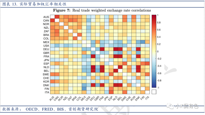 注:图中的每个方块显示了给定国家对实际双边美元汇率的同比对数变化之间的相关性。根据数据可用性,样本周期因国家对而异,最大样本为 1986 年第一季度至 2022 年第四季度。