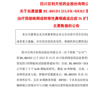 百利天恒3月13日发布的公告信息显示,公司BL-B01D1已开展了5个Ia/Ib期临床研究,覆盖16种肿瘤,目前,已有12种肿瘤的200余例受试者入组,肿瘤评估数据显示,BL-B01D1在该12种肿瘤中均有强烈的有效性信号,且在II期推荐剂量(RP2D)下具有良好的安全性。